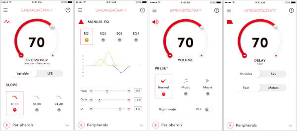 A disposizione, quindi, i controlli per: volume, selezione preset memorizzati, compressione Night Mode, crossover elettronico regolabile in frequenza e pendenza, regolazione della fase. Tutte queste regolazioni possono essere memorizzate e inviate ad un numero multiplo di subwoofer, presenti nella stessa stanza principale o collocati in più stanze della stessa abitazione. Oltre alle regolazioni manuali il sistema mette a disposizione anche la funzione di equalizzazione automatica (Auto EQ) in base all'acustica ambientale.